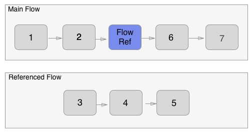 Flow Reference ComponentFlow Reference routes the Mule event to another flow or subflow, executes all processors in the referenced flow, and then routes the event back within the same Mule application. The following diagram shows the order of processing when one flow references another:When the main flow is triggered, the Mule event travels through and executes the flow until the event reaches the Flow Reference. The event then travels through and executes the referenced flow from beginning to end, and then returns to the main flow. This process enables you to treat the entire referenced flow like a single component in your current flow.Mule Ref Doc : https://docs.mulesoft.com/mule-runtime/4.3/flowref-about Correct answer is payload quantity var color query param