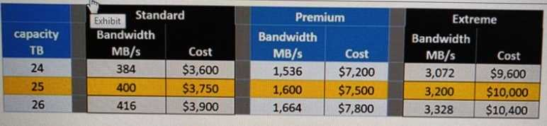 Your application requires 24 TB of capacity and 400 MB/s of bandwidth. Referring to the exhibit, what is the most cost effective combination of capacity and service level for Cloud Volumes Service?