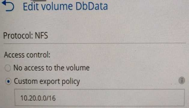 A storage administrator wants to deploy a Cloud Volumes ON1AP volume to store data. Referring to the exhibit, what is the network range of clients that may access the volume using NFS?