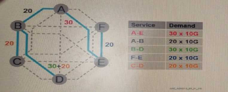 Refer to the exhibit that shows a demand matrix, a network topology with candidate links (in thick blue lines and dashed lines), the defined network in thick blue lines and the demand routing (colored numbers in the figure). Every link is 80 km long.