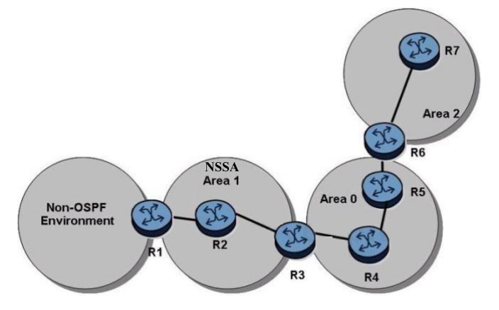 3. Router R1 generates a type 5 LSA that is flooded through area 1. Router R2 generates a type 7 LSA that is flooded through areas 0 and 2.