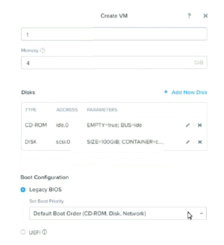 The reference exhibit above is from a newly-created VM. When the administrator powers on the VM. GuestOS installation is not happening. What is causing this issue?