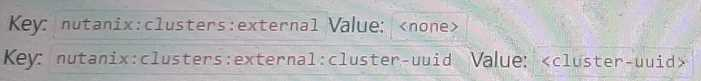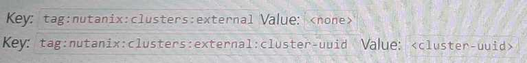 nutanix:clusters:external - Identifies the cluster as external. nutanix:clusters:external:cluster-uuid - Specifies the unique identifier for the cluster, enabling proper traffic routing and access.