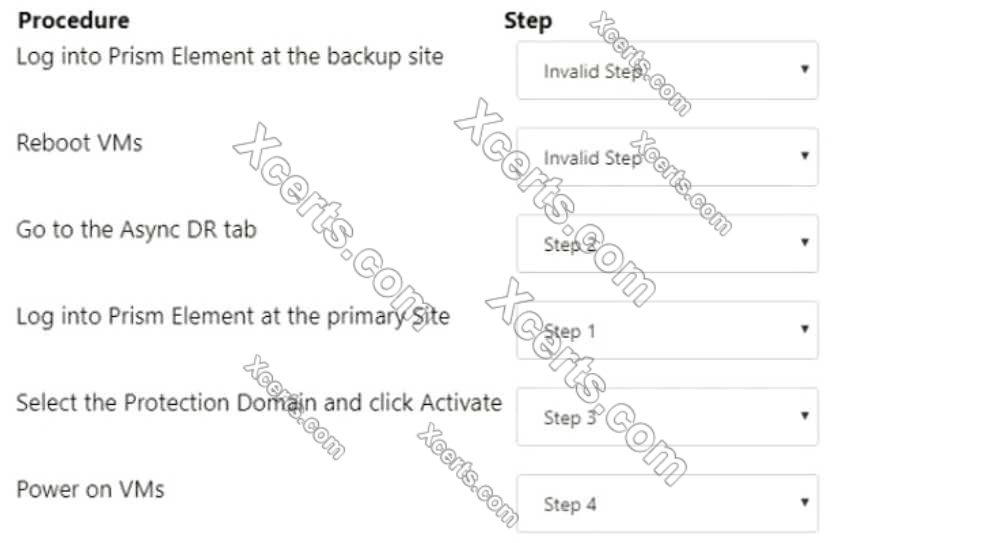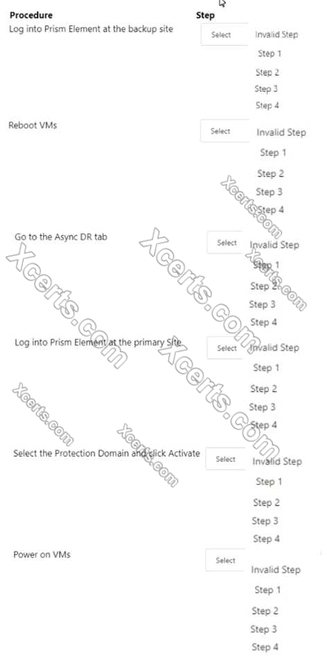Async DR is configured between two sites. A network outage occurs at the primary site. Which steps must the administrator perform to bring the VMs back into service at the backup site? Item instructions: For each procedure, indicate the order in which that procedure must take place to meet the item requirements. Not all procedures are valid. Identify any invalid procedures using the drop-down option.