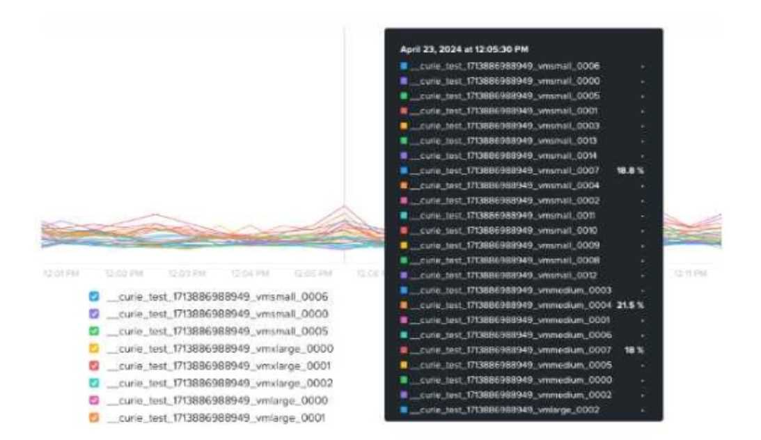 The graph shows CPU Ready Time spikes for multiple VMs. Some VMs have CPU Ready Time exceeding 18% to 21.5%, which is very high.