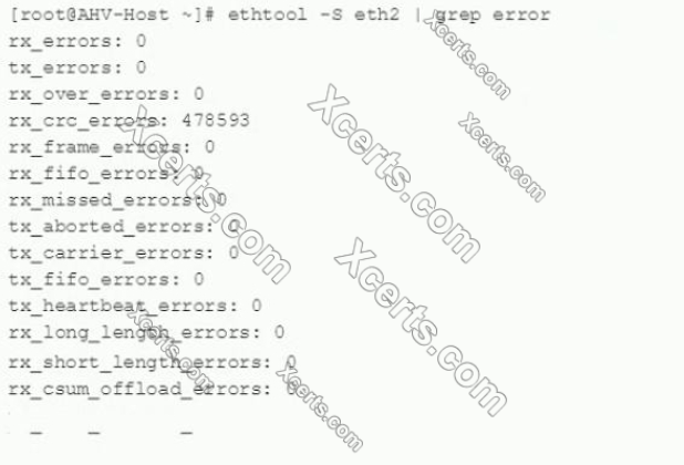 An administrator receives an alert in Prism indicating that interface eth2, on an AHV host is receiving many CRC errors. Aftertogging into the problematic host, the following command is run to show the indicated output: