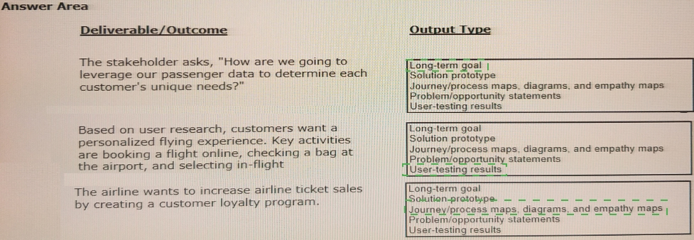 In the first design sprint, during the initial workshop with an airline, you obtain several deliverables and outcomes. In the Answer area, identify the output type for each deliverable or outcome.