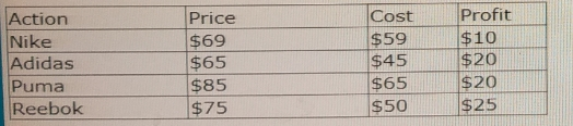 The following decision strategy outputs the most profitable shoe a retailer can sell. The profit is the selling Price of the shoe, minus the Cost to acquire the shoe.