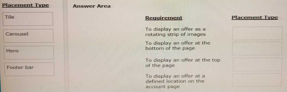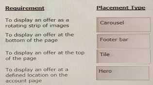 U+ Bank has decided to use the Pega Customer Decision HubTM to recommend more relevant banner ads to its customers when they visit the personal portal. Select each placement type on the left and drag it to the correct requirement on the right.