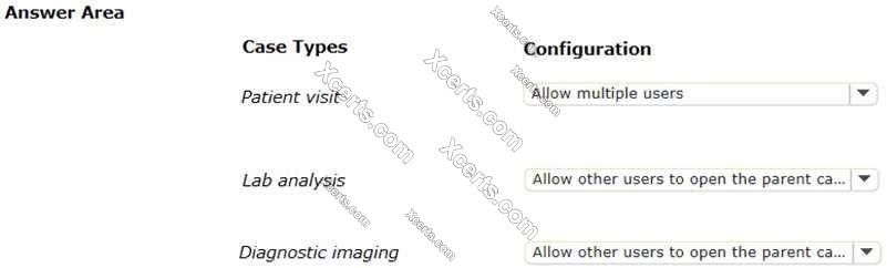 In the Answer Area, select the configurations which allow a doctor or nurse to update the parent case while lab and imaging technologists perform assignments on their respective child cases.