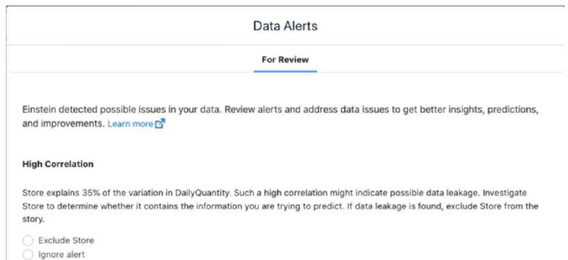 Upon reviewing the data model and noticing the high correlation alert between 'Store' and daily sales quantity, the appropriate action is to verify with the client their expectations regarding the influence of the Store field on daily sales. Here's the rationale: