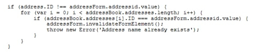 The following code ensures that an address ID CANNOT be used if it is already in use by another address in the customer’s address book. There is a problem with the code. The error message for an invalid address ID is never shown to the user on the form field.