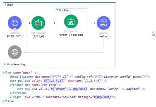 By default, For Each tries to split the payload. If the payload is a simple Java collection, the For Each scope can split it without any configuration. The payload inside the For Each scope is each of the split elements. Attributes within the original message are ignored because they are related to the entire message.
