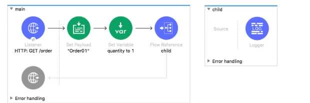 When the main flow is triggered, the Mule event travels through and executes the flow until the event reaches the Flow Reference. The event then travels through and executes the referenced flow from beginning to end, and then returns to the main flow. This process enables you to treat the entire referenced flow like a single component in your current flow.