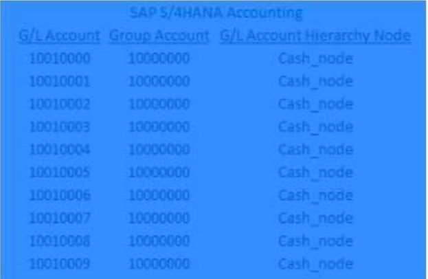 In SAP S/4HANA you have ten cash G/L accounts that belong to one G/L account hierarchy node and one group account as shown in the following table.