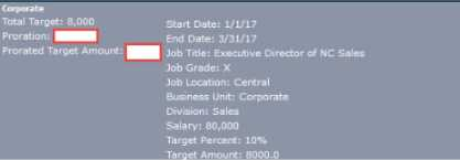 A customer's variable pay program dates are January 1 to December 31, 2017. Given the screenshot below, what are the approximate Proration and Prorated Target Amount for this assignment?