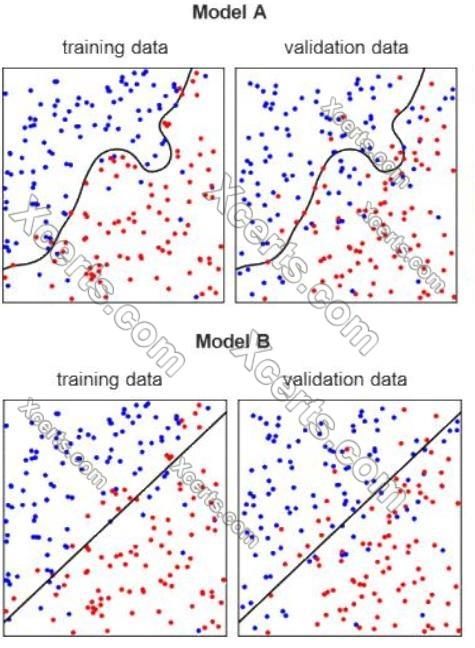 The plots represent two models, A and B, being fit to the same two data sets, training and validation.