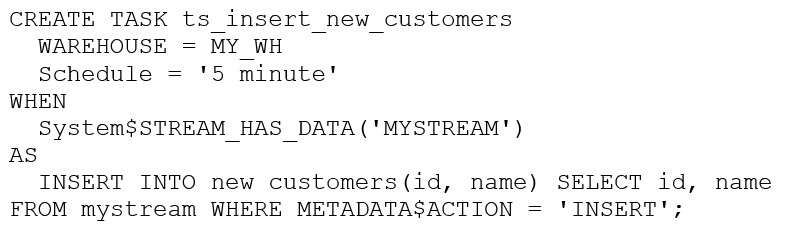 1. The warehouse MY_WH will be made active every five minutes to check the stream.