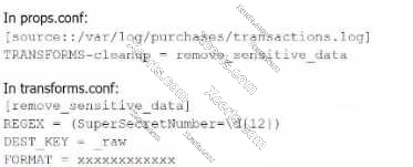 props.conf refers to the transforms.conf stanza remove_sensitive_data by setting TRANSFORMS- cleanup = remove_sensitive_data.