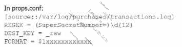 Option B is the correct approach because it properly uses a TRANSFORMS stanza in props.conf to reference the transforms.conf for removing sensitive data. The transforms stanza in transforms.conf uses a regular expression (REGEX) to locate the sensitive data (in this case, the SuperSecretNumber) and replaces it with a masked version using the FORMAT directive.