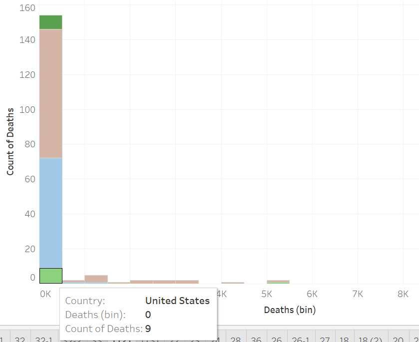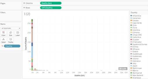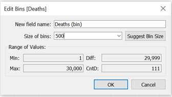 Select the measure "Death" and go to the Show Me and Click on Histogram When we are binning the measure, it will create the dimension, so you get a new dimension as Death (bin). Right-click on this and click on Edit. Update the size of bins to 500.