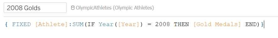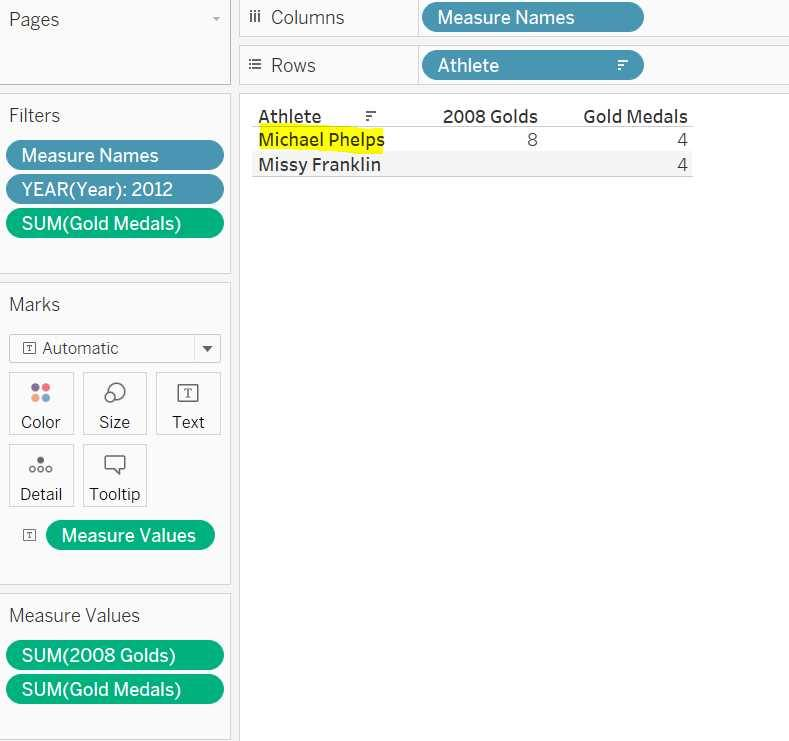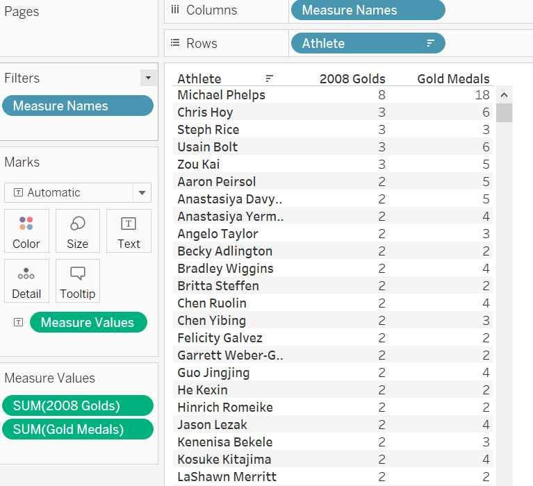 Drop Athlete to Rows and 2008 golds to the Text. Drop gold medals to the view. Your view will look like this: