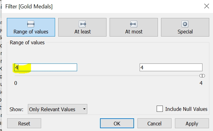 Drop Gold Medals to filter and mention 4 in range of values (as we need to find athletes who won at least 4 gold medals)
