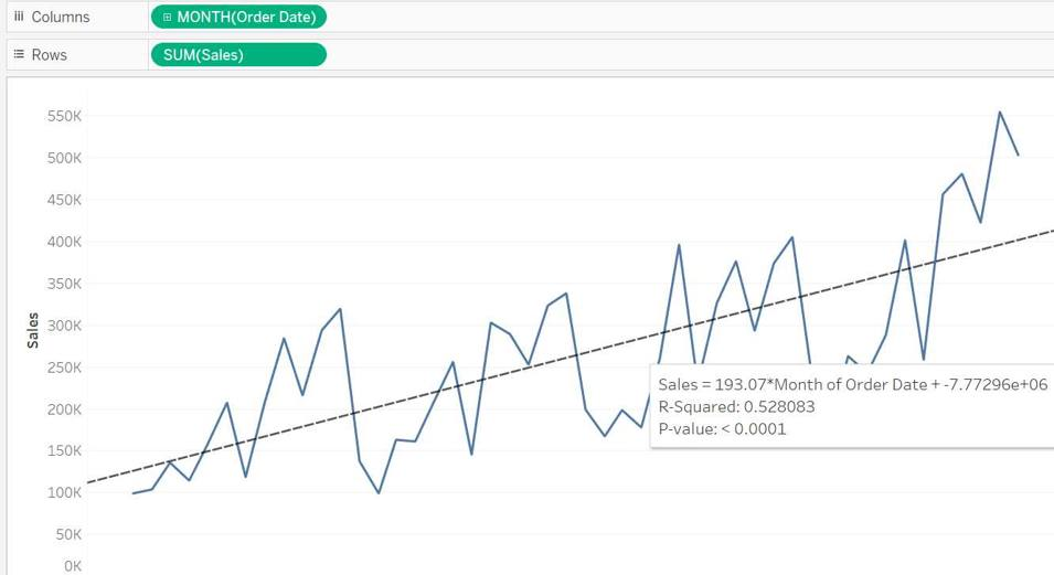 Drop Order Date to the Columns and change it to continuous month. Drop sales to the rows. Go to Analytics and drop the trend line. Check for all trend lines, Linear is having the lowest R Square.