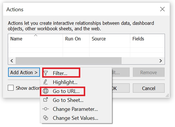 Which of the following are the valid dashboard actions in Tableau?