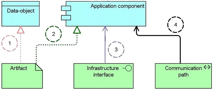 Which relationship modeled in the diagram is not allowed to connect the application layer with the technology layer?