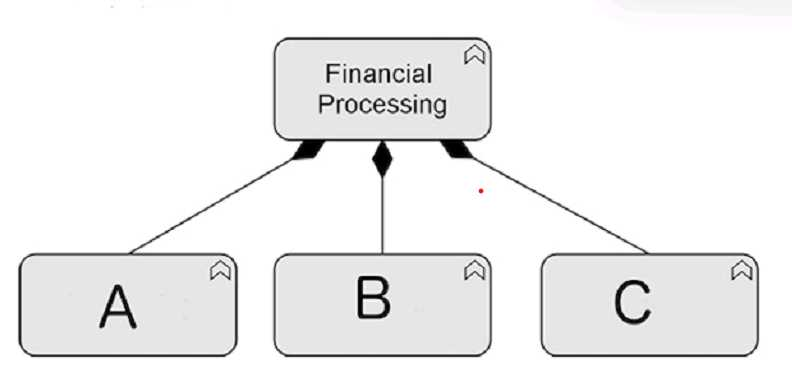 Based on the ArchiMate 3 documents or objectives, the diagram uses a composition relationship to indicate that the financial processing function consists of three sub-functions A, B, and C. A composition relationship is a type of structural relationship that represents a whole-part hierarchy between elements. The notation for a composition relationship is a solid line with a filled diamond at the end that points to the whole element.