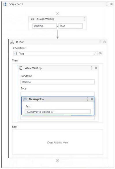 Considering the following sequence of activities, where should the delay activity be added in order to display the message box every 25 seconds?