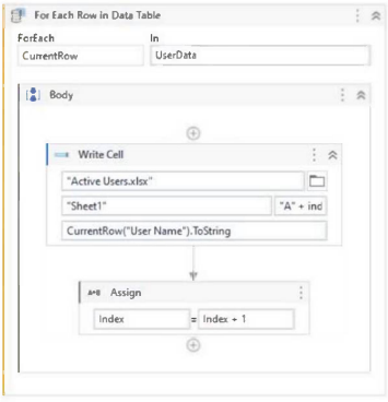4. It writes the values in subsequent rows in the "Active Users.xlsx" Excel file.