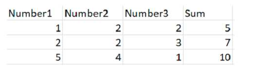 Update the existing rows in the Excel file to include a value for Number3 and adjust the value of Sum accordingly. For example, if Number1 is 1, Number2 is 2, and Number3 is 3, then Sum should be 6.