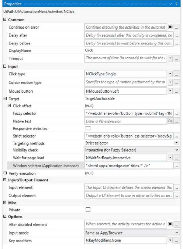 The click type determines which mouse button is used for the click. It can be Single, Double, Down, or Up. The Single and Double types perform a single or double click using the left mouse button. The Down and Up types perform a press or release action using any mouse button. The timeout determines how long the activity waits for the target element to appear before throwing an error. It is measured in milliseconds, and it has a default value of 30000 (30 seconds). If the timeout is exceeded, the activity fails with a TimeoutException. The wait for ready determines when the activity executes. It can be None, Interactive, or Complete. The None option executes the activity immediately. The Interactive option executes the activity after the target element is loaded. The Complete option executes the activity after the target application is loaded.