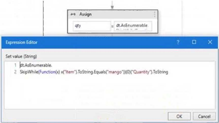 The value of the qty variable will be 80 after executing the Assign activity. This is because the expression in the Assign activity is using the LINQ methods AsEnumerable, SkipWhile, and Item to access the data in the dt variable. The dt variable is a DataTable that contains the following data: