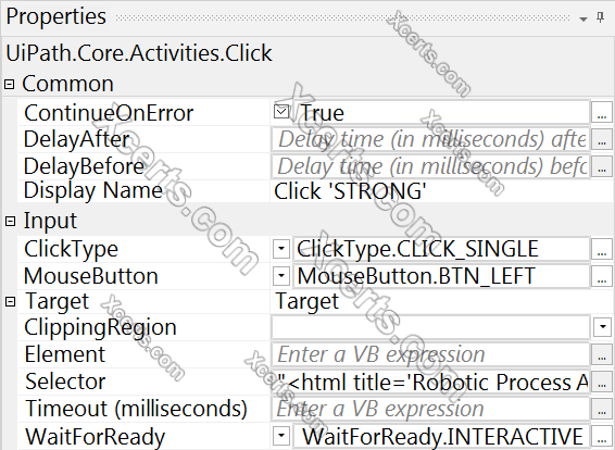 A developer configured the properties for a Click activity on an element inside a web page as shown in the exhibit. An animation on the web page never completely loads but the element specified in the Click activity does.