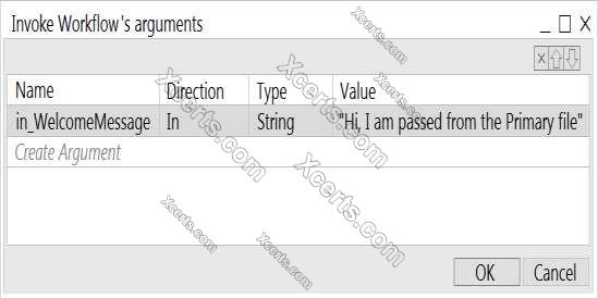 You are invoking a workflow file called SecondaryWorkflow.xaml from PrimaryWorkflow.xaml. The following shows the Import Arguments panel of the Invoke Workflow File activity:
