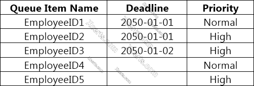 Based on the exhibit that represents the "Deadline" in the yyyy-mm-dd format, what is the correct sequence in which the Queue Items are processed by a single Performer workflow?
