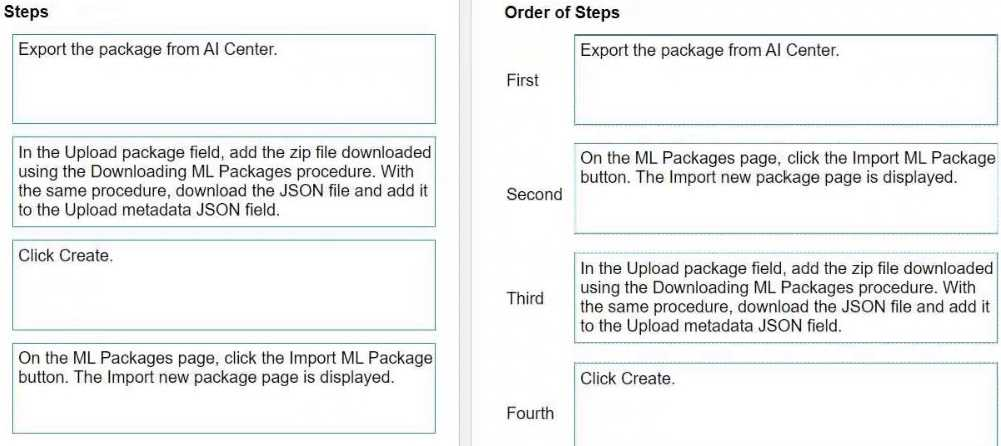 What is the correct order of uploading a package exported from UiPath AI Center?