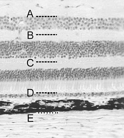 Retinal separation typically occurs at the interface between the retinal pigment epithelium and the outer limit of the sensory (neural) retina. The weakness of this plane is attributed to the manner in which the retina develops, a process that involves obliteration of the space between two of the layers of the optic cup--an inner layer from which the sensory retina arises and an outer layer from which the retinal pigment epithelium arises. Other retinal layers are bridged by neuronal processes, and Müller cells (the retina's glial cells) span the entire thickness of the neural retina. Plane A(choice A) marks the boundary between the nerve fiber layer above and the ganglion cell layer below. The nerve fiber layer is composed of axons of the retinal ganglion cells. Plane B (choice B) is within the inner plexiform layer, the site of synaptic contacts between bipolar neurons, retinal ganglion cells, and amacrine cells. Plane C (choice C) is within the outer plexiform layer, the site of synapses among bipolar cells, rods and cones, and horizontal cells. The boundary between the choroid (of the middle vascular tunic or uvea) and the sclera (of the external, fibrous tunic) is marked by plane E (choice E).