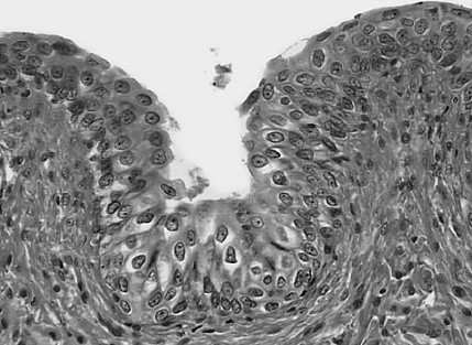 The appearance of this epithelium reveals it to be transitional epithelium. It is stratified with a scalloped surface outline. The cells at the bottom layer are cuboidal in appearance and stained darkly; cells in the intermediate layer are polygonal. Cells at the surface of the epithelium are pale-stained, rounded, and large. Transitional epithelium is characteristic of organs of the urinary system, such as the urinary bladder.