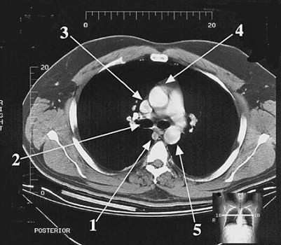 Arrow 1 points to the superior vena cava. The central venous catheter is inserted into the subclavian vein and threaded into the superior vena cava. The ascending aorta (choice A) is labeled by arrow 4 and its counterpart, the descending aorta (choice C) by arrow 5. The azygos vein (choice B) is indicated by arrow