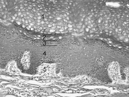Long-term exposure to the sun increases the risk of alteration of the DNA structure by cleavage, ionizing radiation, or recombination of DNA with highly reactive free radicals. These changes can result in neoplastic changes or death in skin cells. In the skin, mitosis occurs only in the malpighian layer formed by the stratum basale and the stratum spinosum of the epidermis. The DNA of dividing cells is more vulnerable to the harmful effects of the sun, and neoplastic changes are usually observed in the Malpighian layer. They are not seen in the stratum corneum (choice A), stratum lucidum (choice B), or stratum granulosum (choice C). Choice E represents the dermis located below the epidermis, which is the only skin layer considered in this question.
