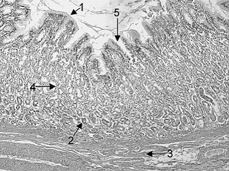 Arrow 3 points to the muscularis mucosae. Arrow 4 points to the middle of the gastric glands where parietal or oxyntic cells tend to be most numerous. Arrow 5 point to the side of a gastric pit where mucus-secreting cells are also found.