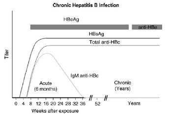 This patient has chronic hepatitis B. The different serologic studies for hepatitis B are shown in two figures below. The patient does not have acute hepatitis B because the IgM antibody to hepatitis B core is negative, and the total antibody to hepatitis B core is positive. Antibody to hepatitis B core occurs prior to the development of antibody to hepatitis B surface. IgM is found in acute infections; primarily IgG is seen in chronic infections.