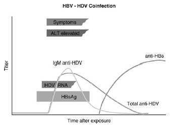 If the patient was found to be HBeAg positive, he would be considered highly infectious for the spread of hepatitis B. Hepatitis Be antigen is the DNA polymerase that shows active replication of the hepatitis B virion. These patients are 100 times more infectious than those lacking the hepatitis Be antigen. The window period is a situation where a patient is just recovering from hepatitis B. Hepatitis Bs antigen is negative and the antibody to hepatitis Bs has not been developed. The diagnosis is made by antibody to hepatitis B core. This is seen in Figure 1-6. Any patient who is hepatitis B surface antigen positive is at risk for delta hepatitis. This patient would be at risk for delta hepatitis by virtue of having a positive hepatitis B surface antigen. There is no level of transaminases, even normal transaminases, which would preclude antiviral therapy. The level of viral production indicated by the hepatitis B quantitative viral load, along with an assessment of the underlying liver pathology, is the best indication of need for treatment. As mentioned earlier, the antibody to hepatitis B would show the patient is less infectious and likely have a lower viral load.