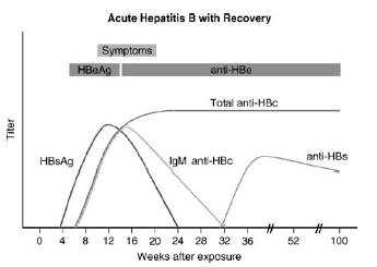 This patient has chronic hepatitis B. The different serologic studies for hepatitis B are shown in two figures below. The patient does not have acute hepatitis B because the IgM antibody to hepatitis B core is negative, and the total antibody to hepatitis B core is positive. Antibody to hepatitis B core occurs prior to the development of antibody to hepatitis B surface. IgM is found in acute infections; primarily IgG is seen in chronic infections.