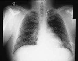 A 34-year-old amateur spelunker develops cough, dyspnea, and fever 2 weeks after a caving expedition to caves in Kentucky. On physical examination, the patient's temperature is 102°F and respiratory rate is 24. On pulmonary examination, there are diffuse crackles bilaterally. A CXR is shown in Figure