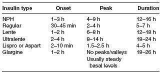 See Table below for onset, peak, and duration of the various types of insulin.